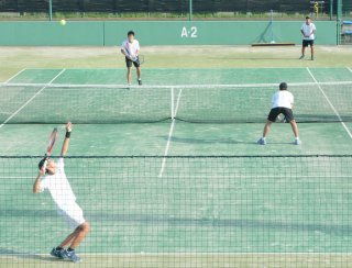 男子ダブルス決勝、野尻・斉藤組(手前)―朝日・青木組