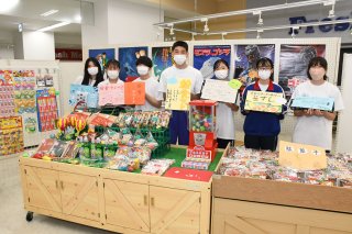 昭和レトロをテーマに商品を入荷。駄菓子や懐かしい玩具に加え、ソフト麺など学校給食の定番メニューが並ぶ