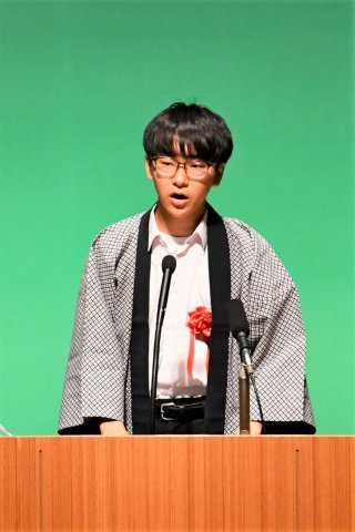 最優秀賞に選ばれた青海中3年の小田島新太君。地域の祭りや伝統芸能を守り、受け継いでいく思いを発表した