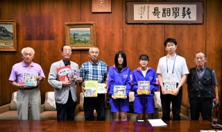 東京糸魚川会から糸魚川市内の中学校へ希望図書を寄贈。図書委員の生徒と学校長が代表して受け取った青海中