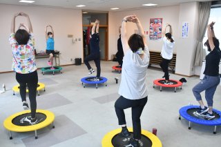 ミニトランポリンを用い、ストレッチやエクササイズを体験した