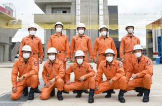 東北大会に出場する「引揚救助」チーム(前列)と「障害突破」チーム。上位入賞による全国大会を目指し、訓練に励んでいる