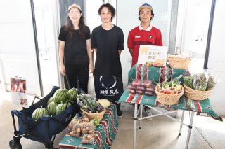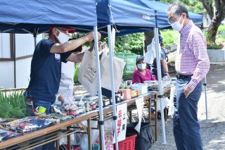 地元産品を多数出品。二本木駅利用者が足を止め、商品を眺めていた