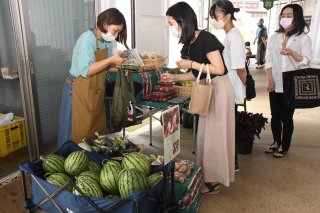 フルサット内の通路で朝市イベントを実施。新鮮な野菜や果物を販売した