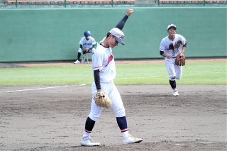 【上越―新潟明訓】上越は三回裏、先発の主戦・近藤佑が相手の強打者・反町を中飛に打ち取りガッツポーズ