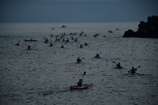 弁天浜をスタートし、終着点の筒石漁港南公園を目指すカヤックの隊列