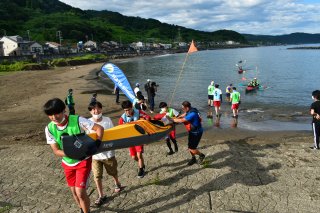 カヤックの終着点では、海洋高生徒らボランティアが陸揚げを手伝った