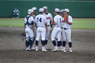 上越は八回裏のピンチの場面で、マウンドに守備陣が集まった