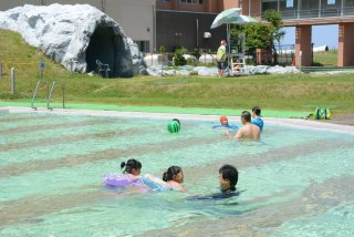 中庭の海水プールで泳ぐ家族連れ