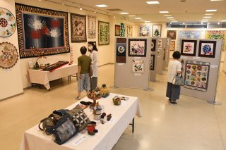 キルトのタペストリーや立体作品など約240点を展示。長さ3メートル近い大型作品も
