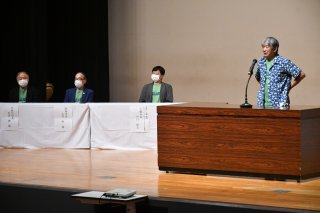 モンベルグループ代表の辰野勇さんがあいさつ。上越3市の市長もそろって出席した