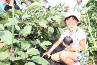 上越野菜「越の丸なす」を収穫。大きく、艶のある実に笑顔があふれた