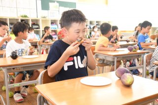 越の丸なすをピザトーストにして試食。普段ナスが嫌いな児童もおいしさに驚きの声を上げていた