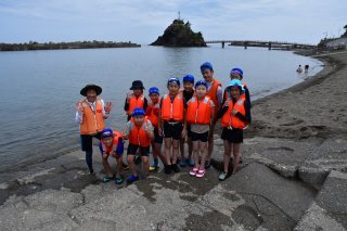 長野市臨海体験学習で糸魚川市能生地域を訪れた戸隠小の5年生児童(14日午前、能生海水浴場)