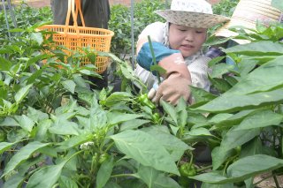 住宅地の一角にある畑でピーマンを収穫するスタッフら