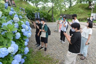 北堀で開花しているハスを数える吉越さん(奥)と会員