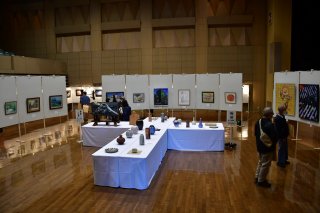 広々とした会場に会員の丹精した盆栽と山野草を共に配置した合同展