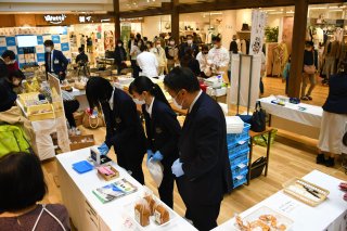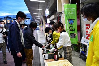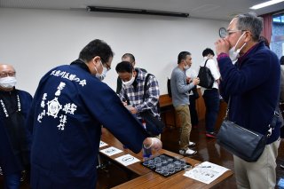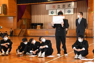 長谷川支部長(左)が平野会長(中央)に図書カードを手渡した