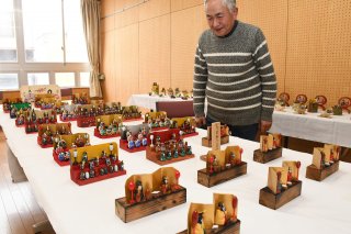 3面:上越市国府1の齊京十四春さん 手作りひな人形展示 材料に木の実使用 素材生かした150組並ぶ 直江津ふれあい館で