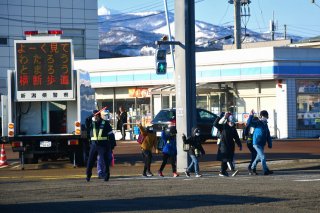 14面:〈横断歩行者を守る交通事故防止運動〉「渡るよサイン」忘れずに 警察官が呼び掛け 登校児童生徒を横断歩道で見守り 上越署
