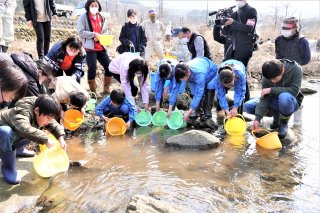 1面:思い込めサケ稚魚放流 統合閉校、「今年で最後」 木浦小