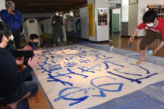 10面:全身で力強く 牧小6年生卒業記念で詩を大書