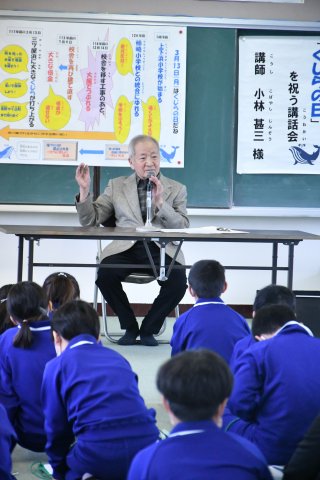 9面:クジラの命に感謝 小林甚三さんら講話 肉売り学校存続 逸話学ぶ 上下浜小